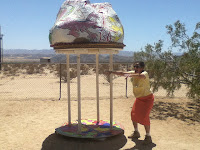 Monday 07- it’s been kinda windy all day I did my stretches, lifted dumbbells, rode my bike, core trainer, yoga, lifted weights, punched heavy bag, and ran up the hill and back carrying 5lbs in each hand. Linda Sibo called to ask if I wouldn’t mind coming over to help Blake move her giant brain onto a platform. Stacy from the Hi-Desert Star was coming over to take pictures of the Brain and interview Linda. The Brain is an approximately four foot round by three feet high paper mache applied to chicken wire brain shaped object that must have weighed over fifty pounds. We had to lift it and seat it upon four foot high stilts; we figured it out after a few attempts. Stacy came and took a bunch of pics and I went home to rest my poor body after all that work…