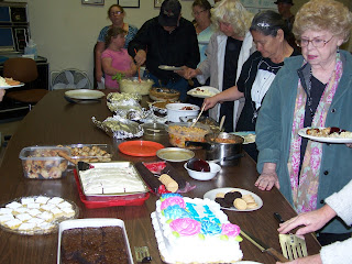 I arrived at the community center early but there were already a few cars there; always a good sign. It was Chris Jonas and his granddaughter Anna’s birthday; Karry Kearns brought a big birthday cake from Stater Brothers for the both of them. Before we all got in line for the food we all sang Happy Birthday. There was whole bunches of cakes, cookies and sweets things for us to eat this time. Desserts come in waves; sometimes there isn’t any desserts because at the last potluck folks brought too much, so I’m figuring that next potluck there’ll not be any or very little.
